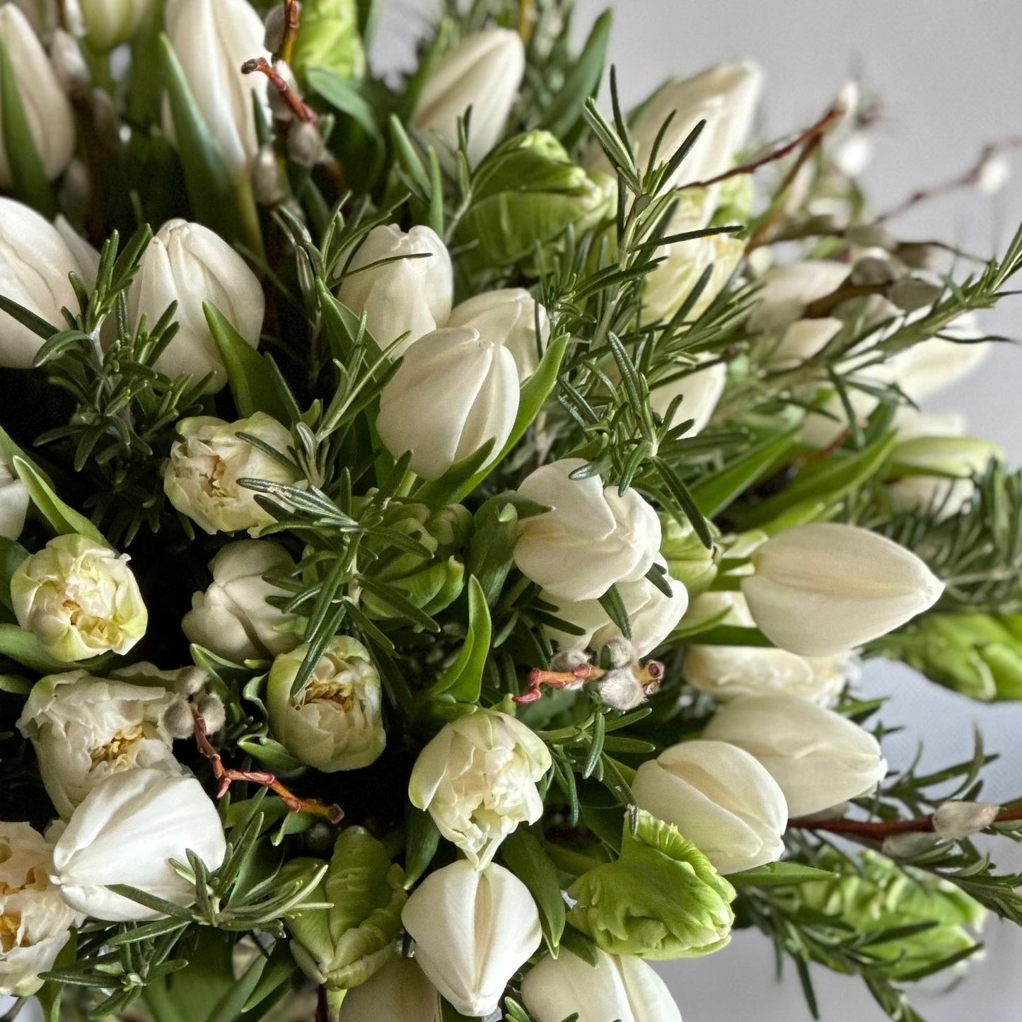 You can also choose a vase arrangement, for which the Margaret with its white tulips, pussy willow and greenery, is perfectly suited.