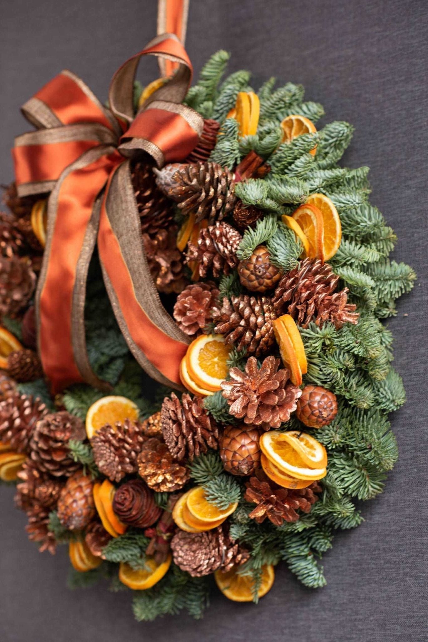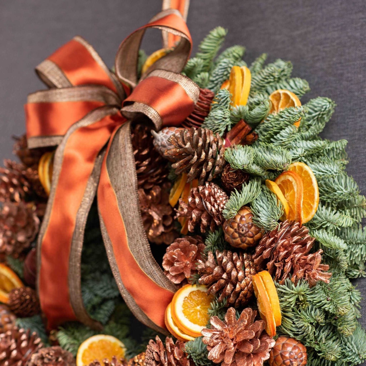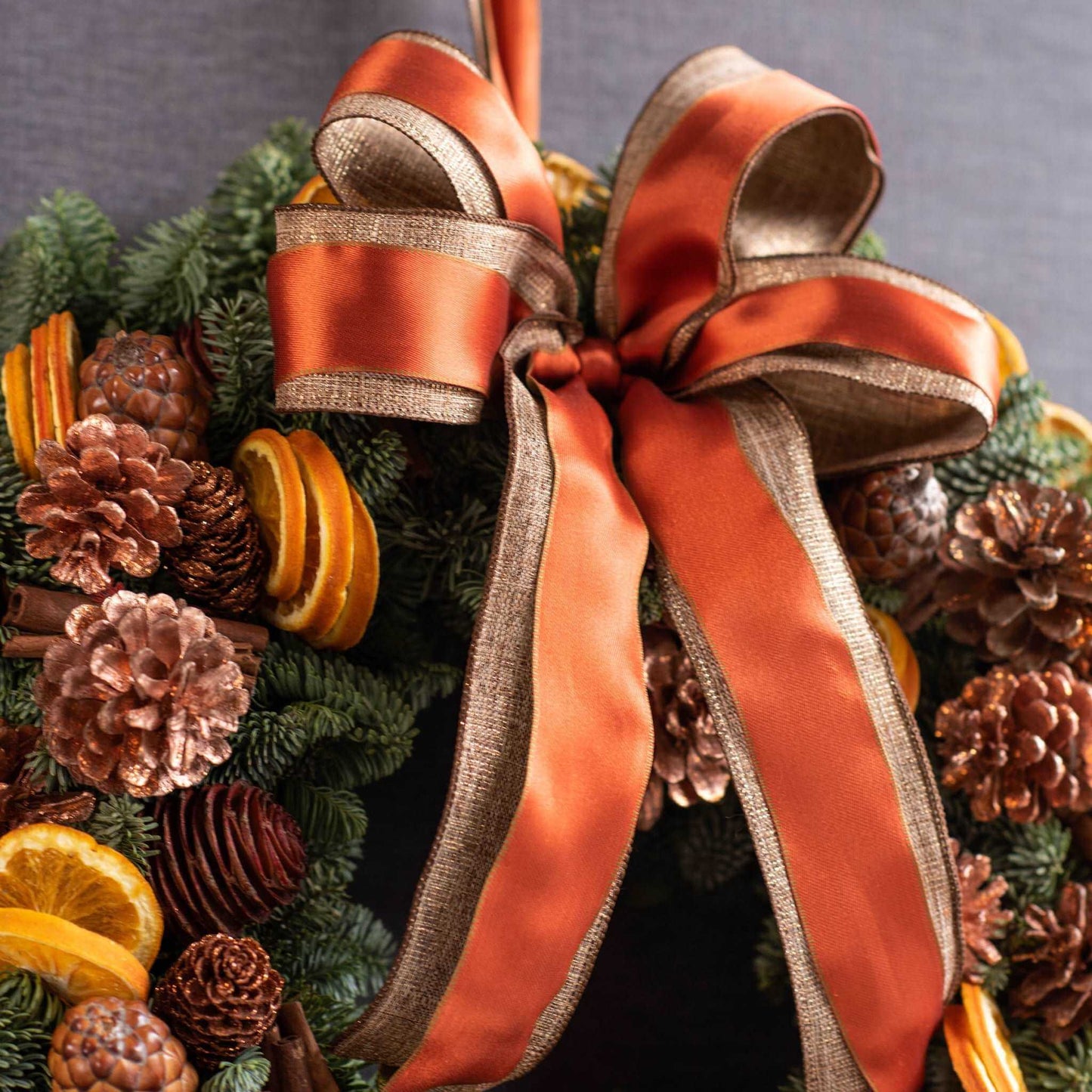 A magnificently crafted piece, skillfully created out of spruce pine, natural cones, dried orange and bunches of hand-tied cinnamon. The Norfolk wreath is draped with a copper-coloured satin ribbon. This wreath is one of our most colourful and exquisitely fashioned by our distinguished Pulbrook & Gould florists.