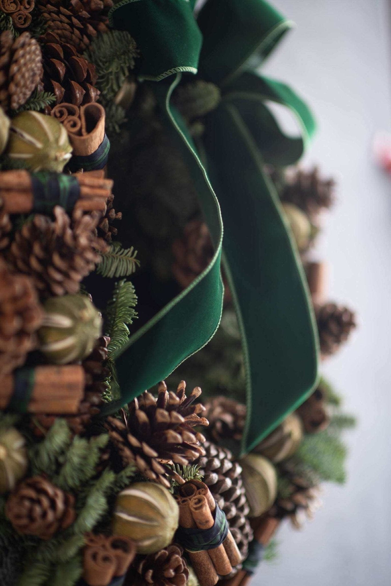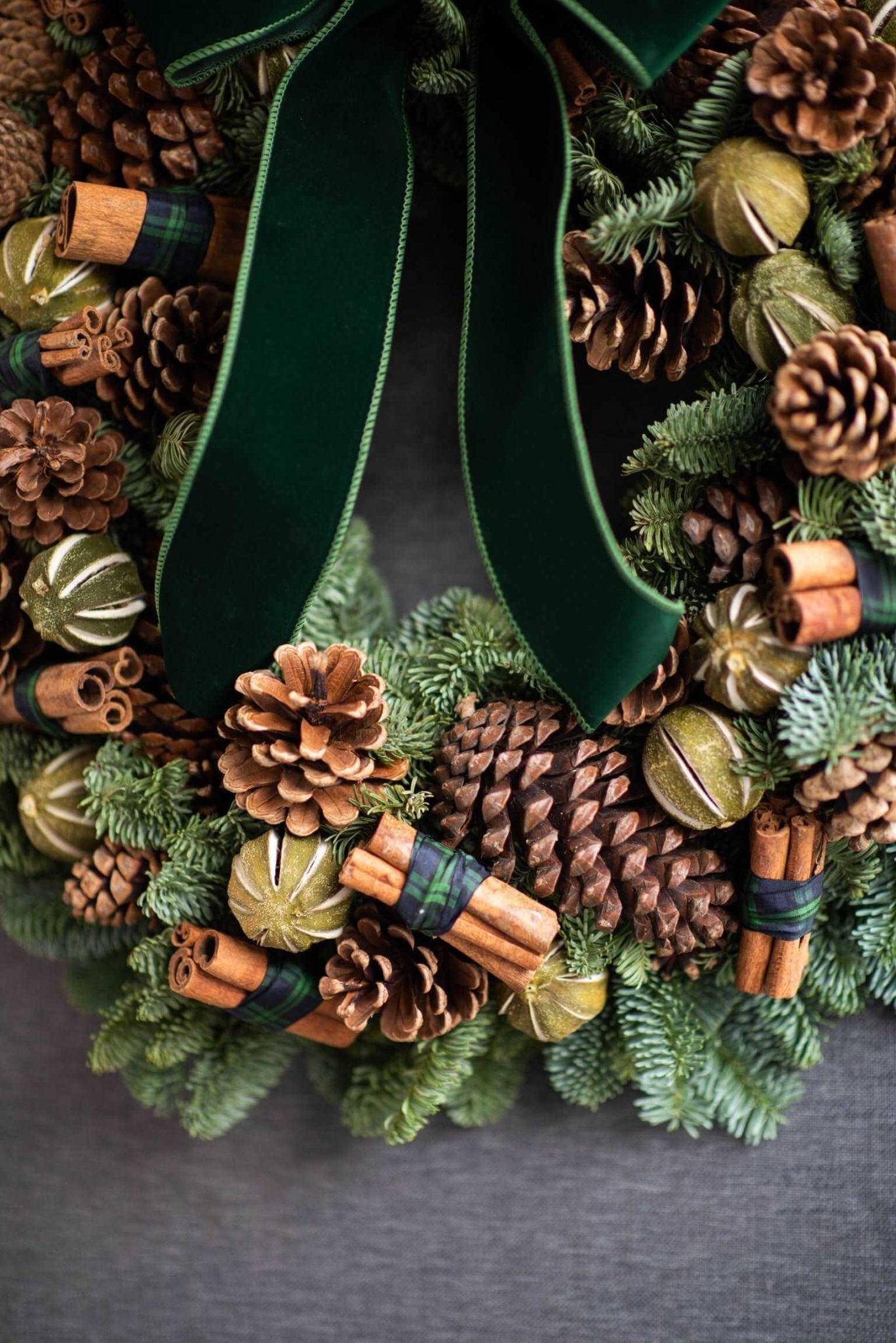 A gorgeous handmade wreath crafted from blue spruce pine, natural pine cones and dried limes. The Northumberland wreath is adorned with hand-tied cinnamon and finished with luxurious emerald velvet ribbon, skillfully constructed by our talented florists in the incomparable Pulbrook & Gould tradition.