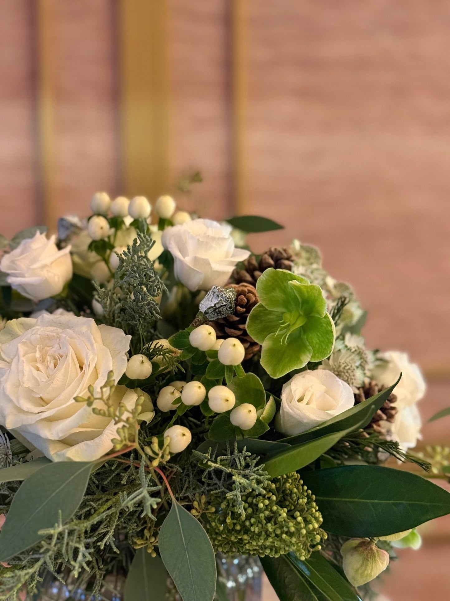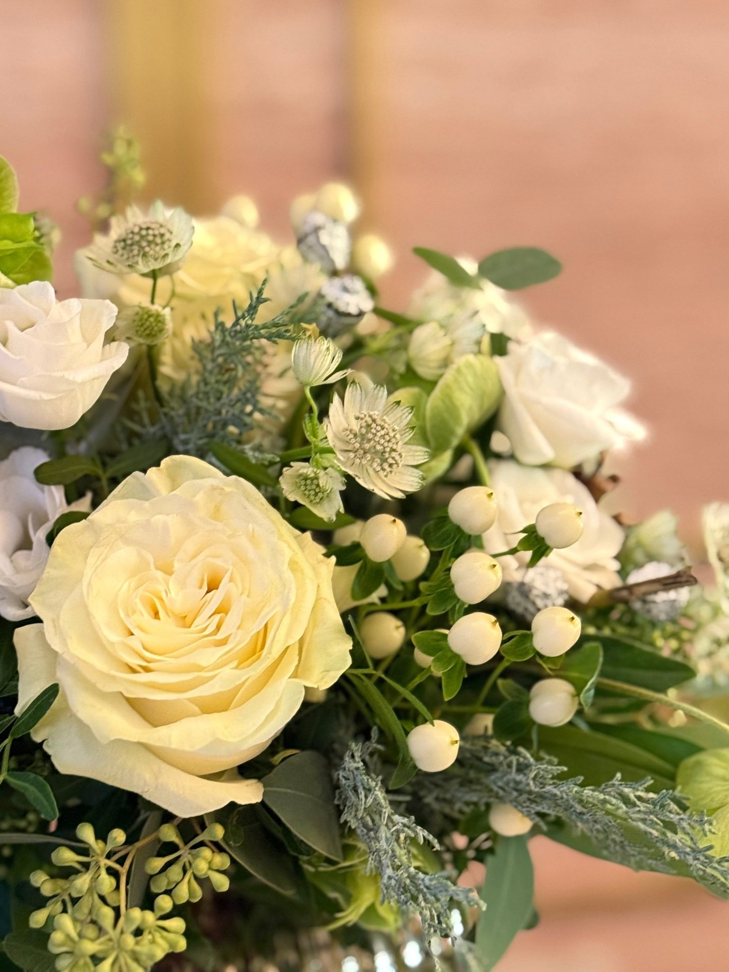 An English garden in winter…but brought inside to beautify your home. Lisianthus, white roses, astrantia and pinecones with seasonal foliage and winter greenery. It’s a posy with such personality, as a gift for someone or as a treat for yourself.