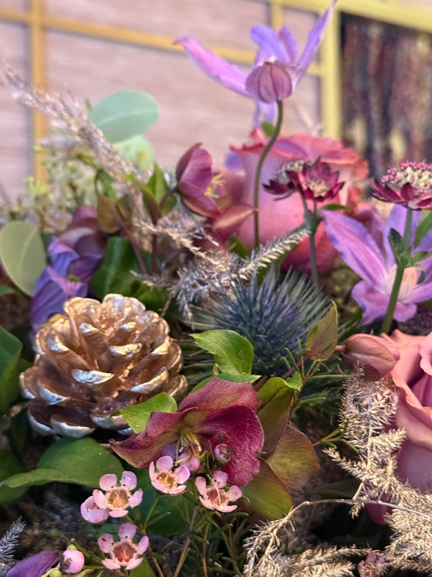 Featuring all the best wintery flowers, including hellebores, thistle and wax flower, the Dasher is a beautiful mixture of purple shades and seasonal greenery. Roses, astrantia and clematis are included in the Dasher hand-tied bouquet or vase arrangement with the all-important pinecones peeking out. A wonderful gift for friends and family.