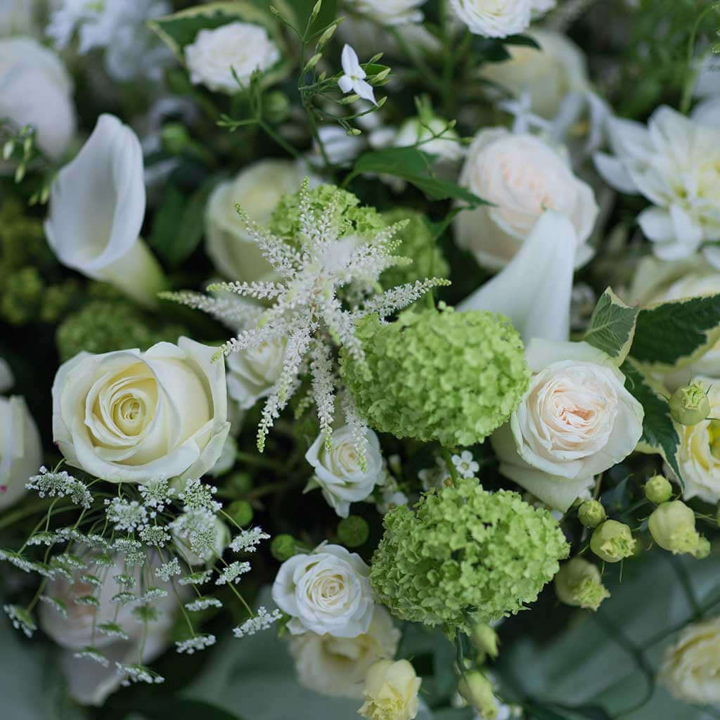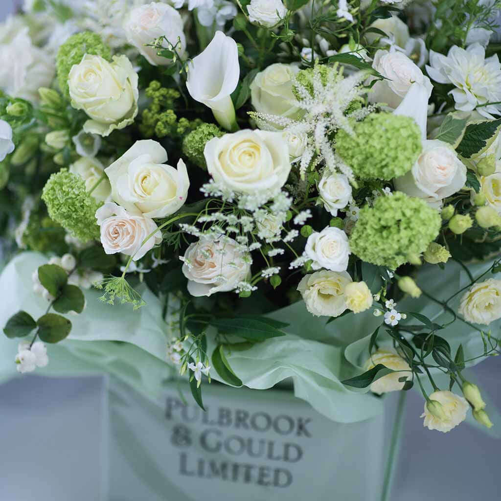 Celebrate friends and family with this refined arrangement of seasonal white blooms, expertly curated by Pulbrook & Gould. White roses, spray roses, calla lillies and lisianthus are carefully combined to highlight each flower's natural grace.