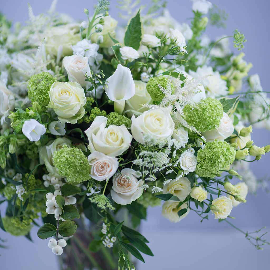 Dahlias and delicate sprays of astrantia; Queen Anne's lace, viburnum and eucalyptus provide a soft green backdrop, enhancing the floral display. Timeless Whites captures the essence of meaningful connection through the language of flowers, a memorable gesture that speaks volumes.