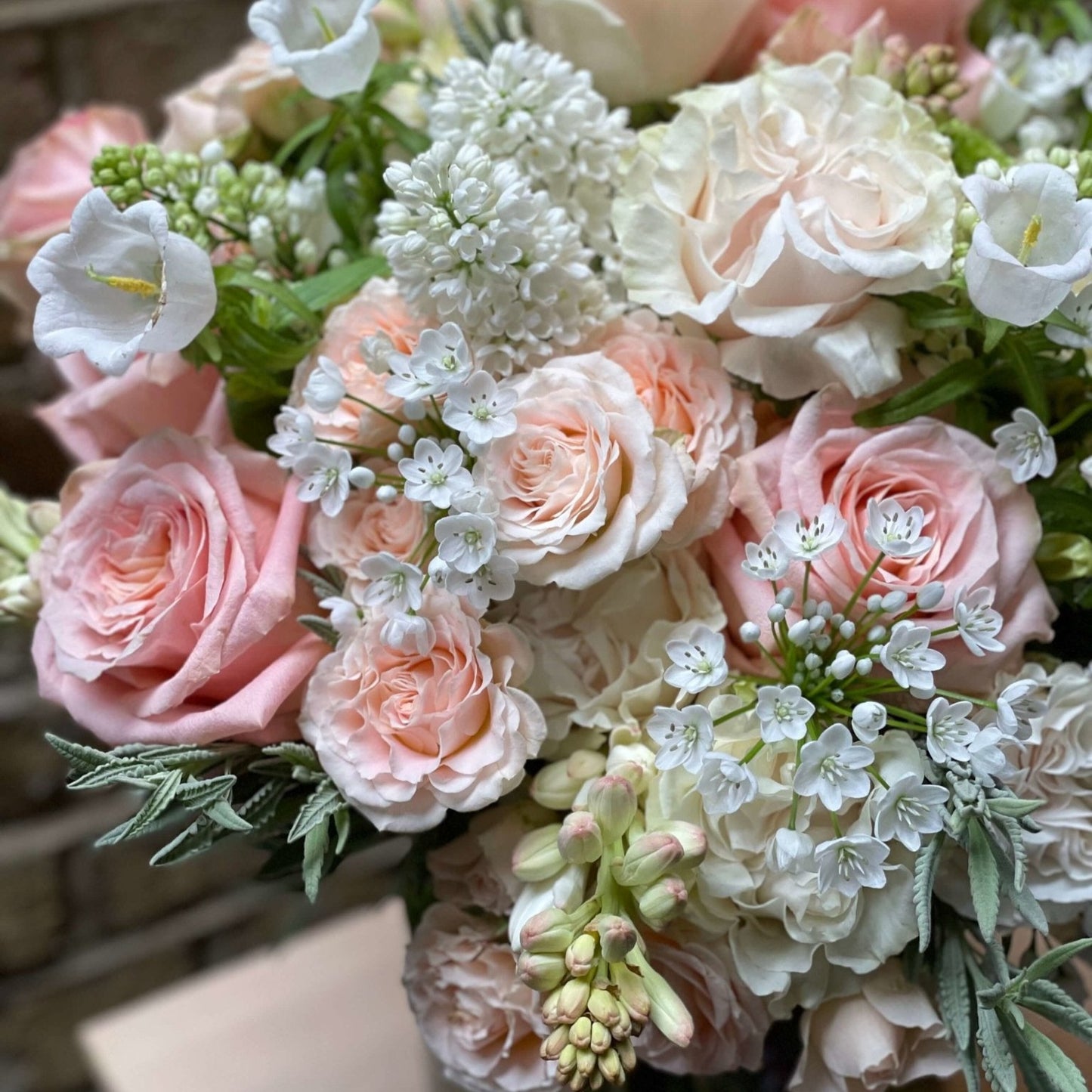 Indulge your beloved with this exquisite vase filled with a stunning mix of pastel pink roses, sweetly scented white lilac, gentle Quicksand roses, delicate white campanula, and fragrant hyacinths.