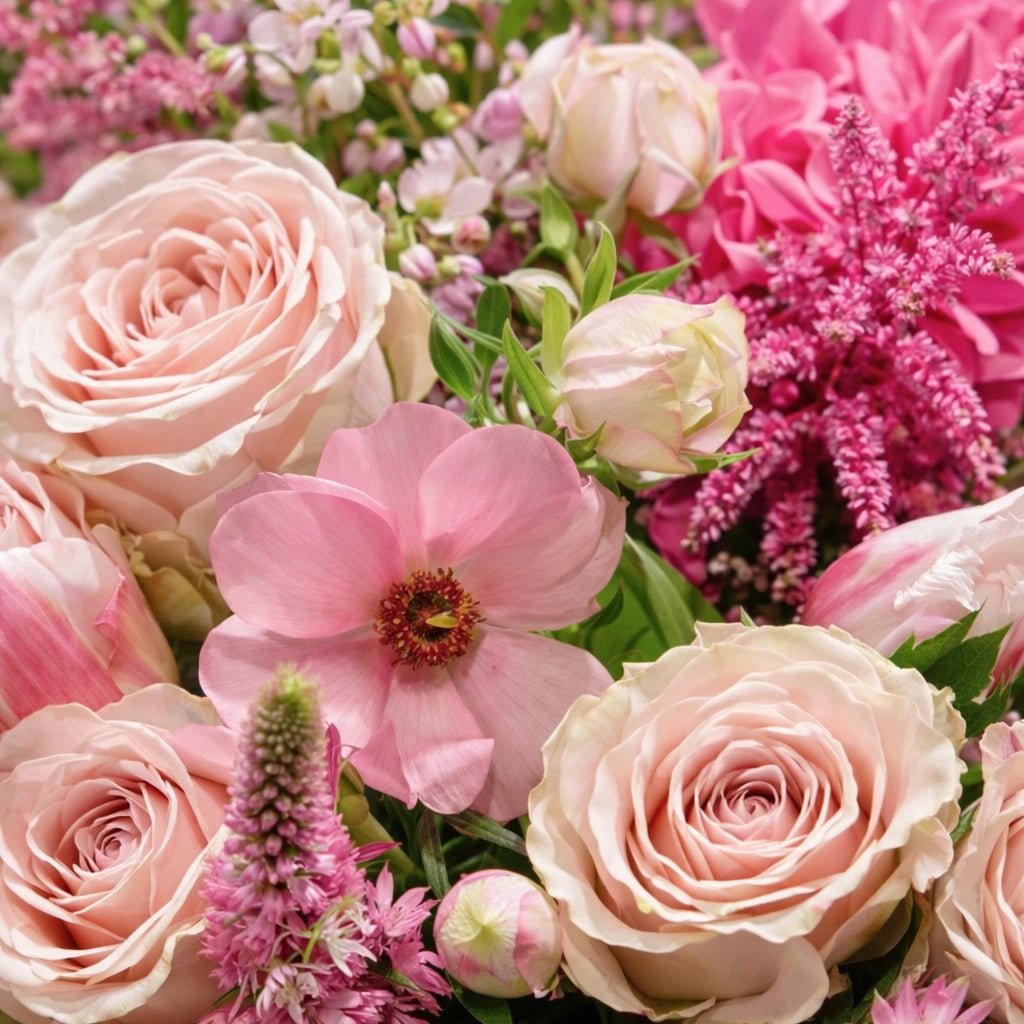 Expect a harmonious blend of roses and spray roses; graceful tulips, delicate scabiosa, vibrant anemones and classic carnations. Other highlights include Veronica, astrantia, viburnum, Queen Anne’s lace, and fragrant waxflower. It's a glorious mixture of blooms that come together to form a breathtaking display.